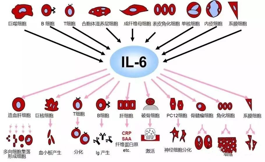IL-6能够促进T细胞群体扩增和活化以及B细胞分化,调节急性期反应,可以影响血管疾病、脂质代谢、胰岛素抵抗、线粒体活动、神经内分泌系统和神经心理行为的激素样属性。此外,IL-6促进破骨细胞和血管生成的分化、角化细胞和肾小球膜细胞的增殖、以及骨髓瘤和浆细胞瘤细胞的生长。