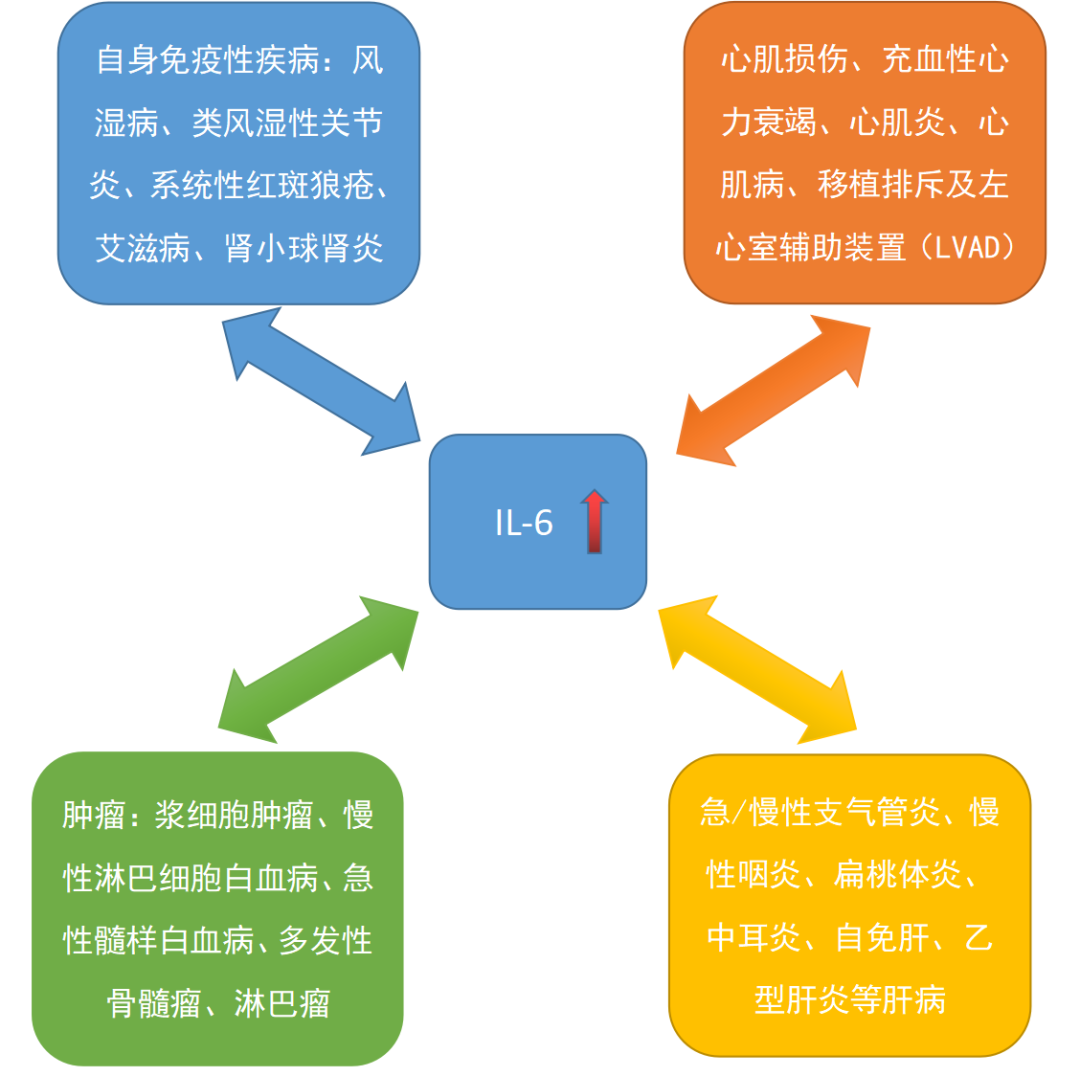 白细胞介素是由多种细胞产生并作用于多种细胞的一类细胞因子。IL-6是细胞因子网络中的重要成员,在临床多领域有广泛应用,如调节多种细胞的生长与分化、免疫应答等,参与多种临床疾病的病理过程,包括细菌感染、新生儿败血症、呼吸系统衰竭、系统性红斑狼疮、肠炎、心血管疾病、类风湿性关节炎等各种急性和慢性炎症疾病。